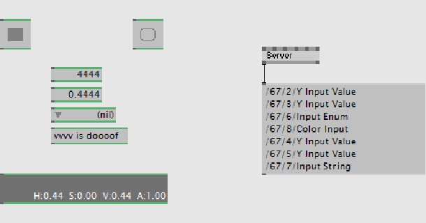 now of course you don’t want to do this all random and find out about the target-addresses manually. as mentioned in a previous posting refactor-to-subpatch there is one primary shortcut left on vvvvs keyboard cheat-sheet which we saved for this moment: ctrl+k (read “kontroll”) allows you to expose selected IOBoxes for being controlled from the outside. first exposing only turns IOBoxes green, but inside this sets a flag on the node that can be accessed via the plugininterface which e.g. allows a node like the afformentioned Server (VVVV) to return a list of all exposed pins’ osc addresses…