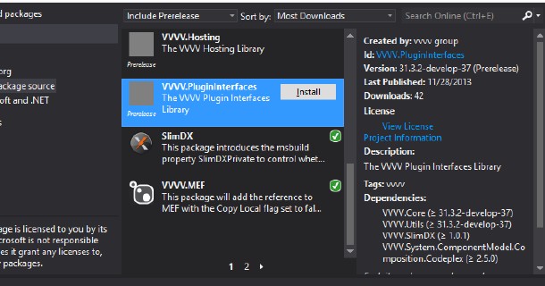 - Add http://teamcity.vvvv.org/guestAuth/app/nuget/v1/FeedService.svc/ as a NuGet package source in the settings of the NuGet package manager shipped with either Visual Studio or Sharp Develop.