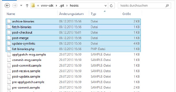 Navigate to vvvv-sdk.git\hooks and delete all non-sample files like this: