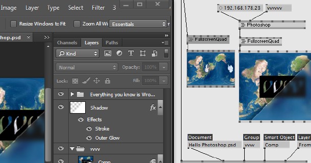 From now on vvvv can talk, control, send and receive images to and from your Adobe Photoshop started on any networked machine. Layers, Groups, Masks, Smart Objects, Adjustment and Filter layers, Tools, File Operations… you name it, everything can be controlled remotely.