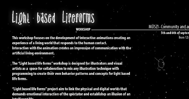 The “Light based life forms” workshop is designed for illustrators and visual artist as a space for collaboration to mix any illustration technique with programming to create their own behaviour patterns and concepts for light based lifeforms.