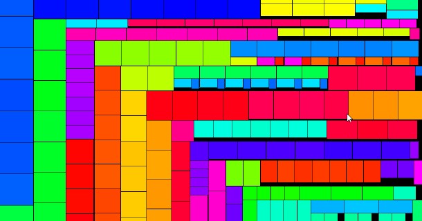 However notice it is not at all as efficient as Czachurski in terms of filling the space with lots of rectangles. Same random rectangles are using 22845×24232 pixels. It does a slightly better job at mostly square shaped textures though (here 8448×8704 pixels)