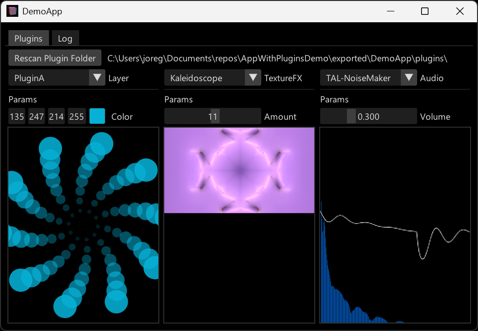 For each of those types of plugins the app shows a drop-down allowing you to choose between different plugins to be executed. Each type of plugin has its own interface to implement. These interfaces are entirely up to your own design, those provided are mere minimal examples. Plugins implementing your interfaces can be developed and exported individually.